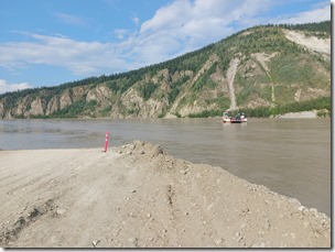 La première est la barge que nous devons prendre pour atteindre Dawson, la première ville après la frontière ! Bonne surprise, le service fonctionne en permanence, toute la journée ! Cette ancienne cité des chercheurs d’or a perdu son effervescence; on a juste le temps de faire quelques courses dans le petit supermarché qui ferme au milieu de l’après-midi. Ici le temps semble être au ralenti… Une station publique nous permet de faire le plein d’eau potable. Des raccords de citerne sont prévus, certains villages ou habitants isolés doivent venir s’approvisionner ici.